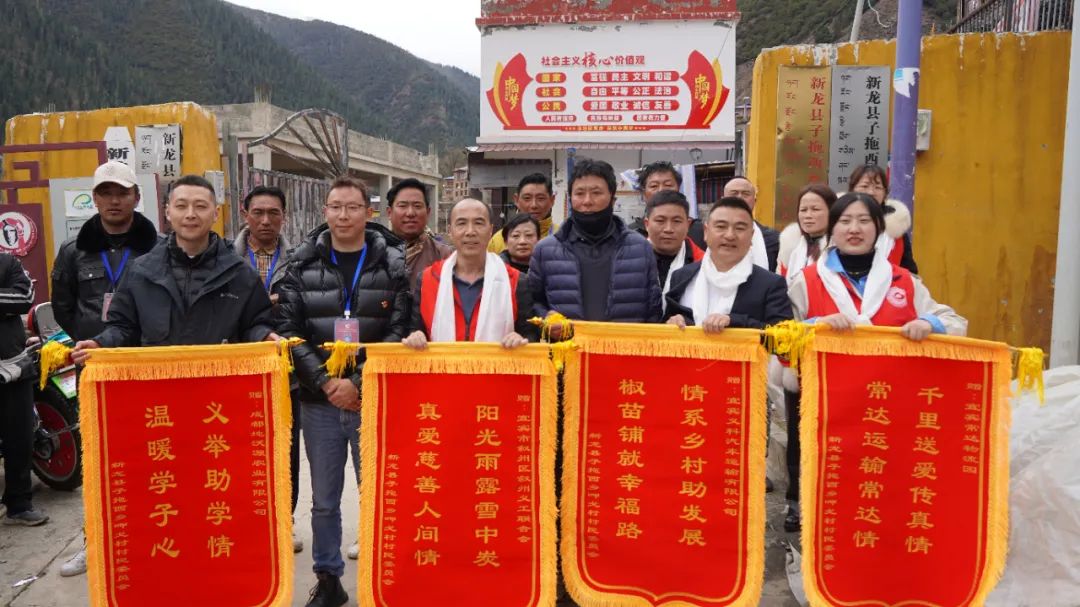 据悉,自2024年以来,叙州区叙州义工联合会、宜宾义科汽车运输有限公司就已赴子拖西乡开展爱心捐赠活动,并资助了三名初高中学生,一直以来心系新龙。爱心企业代表余伟表示:“感恩相聚,缘分传递。看到孩子们的笑脸,我们真切感受到公益的意义,希望这些物资能陪伴他们健康成长。”随后,爱心团队马不停蹄前往呷戈村。村民们手捧洁白哈达欢迎大家的到来,驻村第一书记代表村两委和全体村民为他们送上 “阳光雨露雪中炭,真爱慈善人间情” 等锦旗。此次爱心团队特地为村民们带来了500株经济作物——花椒树苗,并与村民一同前往地里栽下了树苗;此外,还带来了2040件冬季衣物。这些不仅是御寒物资,更是乡村振兴的 “希望苗”。